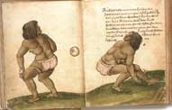Художником Кристофором Вейдицем, путешествующим вместе с Кортесом. Вот как описывал эту игру сам художник:"У индейцев есть игра в надутый воздухом мяч. Они ударяют по нему задней своей частью своего тела, не отрывая рук от земли. Индейцы носят кожаные перчатки, а та часть тела, которыми они ударяют мяч, защищена кожаными повязками."